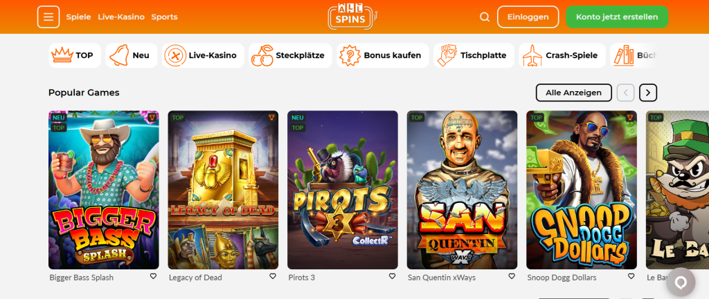Wenn Sie einem Komplettanbieter mit klarem Design bevorzugen, können wir Ihnen AllSpins empfehlen. Seit 2025 können Sie Ihren Streifzug durch Slots, Tischspiele und Live Dealer Games unternehmen.